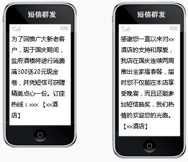 1【如家酒店】為了回饋廣大新老客戶,現(xiàn)于國慶期間,xx酒店將進行消費滿300送20元現(xiàn)金卷,并憑短信可獲贈精美點心一份。訂座熱線:xxx 【群發(fā)此短信給當?shù)厥謾C】